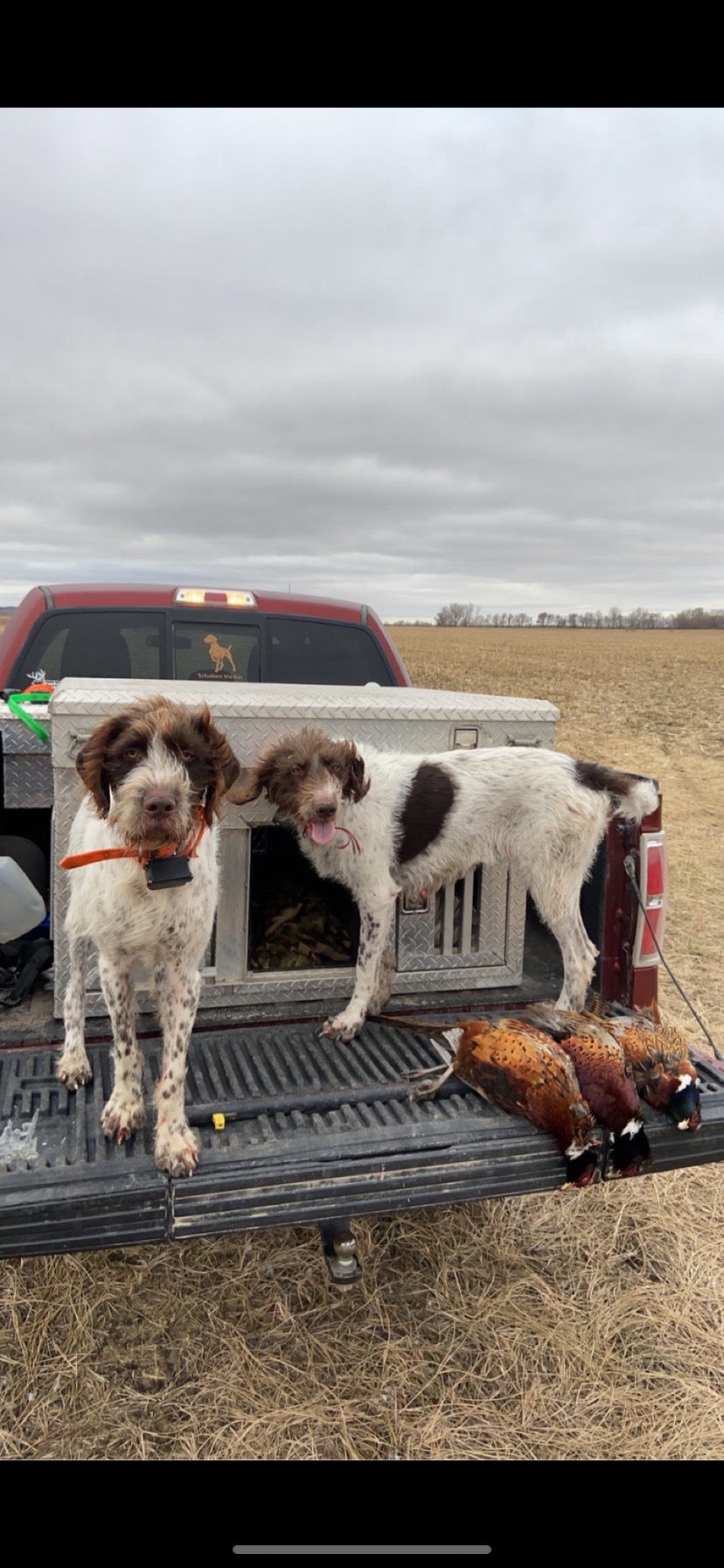 Yeti is the son to our first German Wirehaired Pointer, Nelly. Yeti holds a lot of her traits, including being an absolute bird finding machine! Yeti is owned by our close family members Lee and Jocelyn. He has longer liver, white, and roan coat. Yeti is the life of the party and has a personality of his own. He has a great retrieve. He is fearless and will go into the thickest cover to find those hard-to-get birds. We look forward to producing some amazing German Wirehaired Pointers out of Yeti!